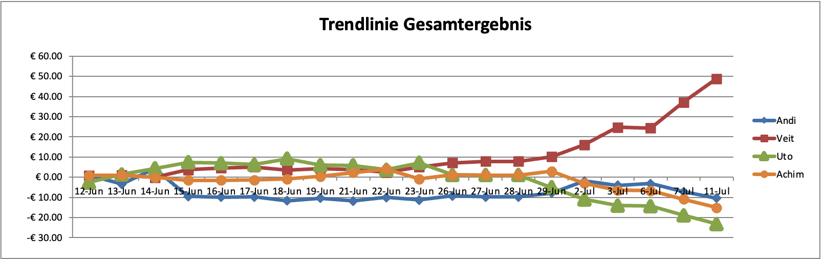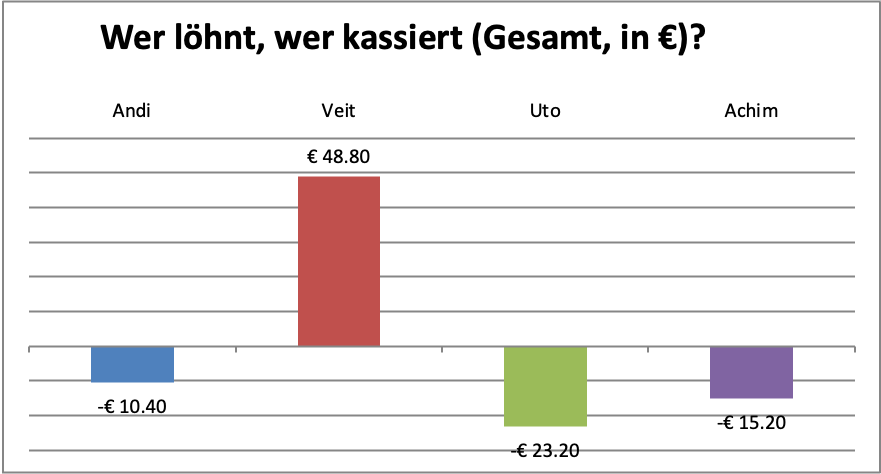| Gesamtergebnis | Andi | -€ 10.40 | Veit | € 48.80 | Uto | -€ 23.20 | Achim | -€ 15.20 | Aktualisiert: | 11. Jul 21 | ||||||||||||||